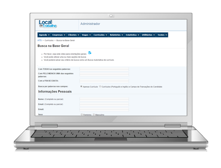 Com todas as palavras do currículo indexadas, você tem uma poderosa ferramenta de busca que pode encontrar qualquer palavra ou expressão que você desejar. Busca por palavra-chave – Busque cada uma das palavras do currículo em segundos, ou encontre um candidato pelo nome ou e-mail. Busca avançada – Busque candidatos por nome, palavra-chave ou informações do perfil. Busca por categoria – Organize suas buscas por categorias. Agentes de busca – Construa seus requisitos e deixe que os agentes automáticos façam a busca constantemente por você.